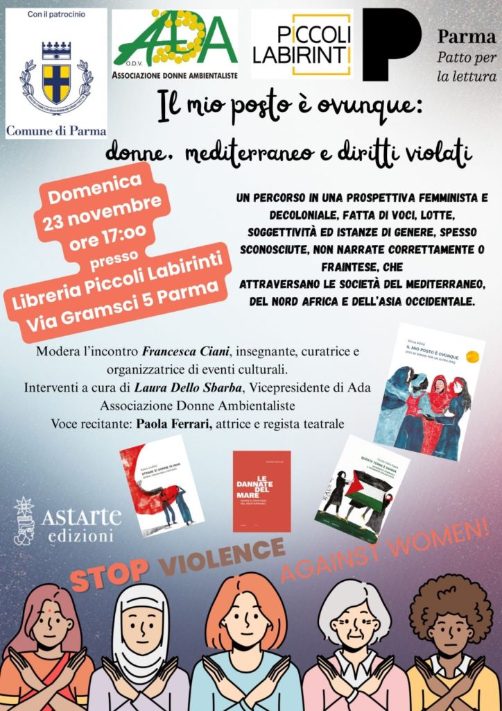 “Il mio posto è ovunque: donne, mediterraneo e diritti violati”- domenica 23 novembre 2025- ore 17.00 – presso la Libreria Piccoli Labirinti a Parma con ADA per la Giornata Internazionale contro la violenza sulle donne.