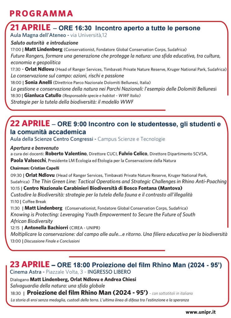 Saranno incontri aperti a tutti. In 3 giornate, attraverso approfondimenti con esperti e la proiezione di un importante docufilm, verrà offerta una prospettiva sulle sfide contemporanee della conservazione della natura in Africa e in Italia e una riflessione sulle pratiche e sui principi che guidano la tutela della biodiversità a livello globale.
