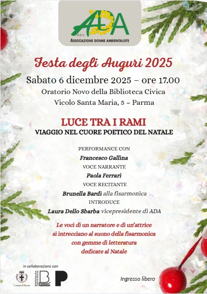 ADA odv – Associazione Donne Ambientaliste, in occasione della Festa degli Auguri 2025, offre a tutta la cittadinanza la nuova rappresentazione scenica “Luce tra i rami”, in collaborazione con la Biblioteca Civica Di Parma, nell’ambito del Patto di Parma per la lettura.
