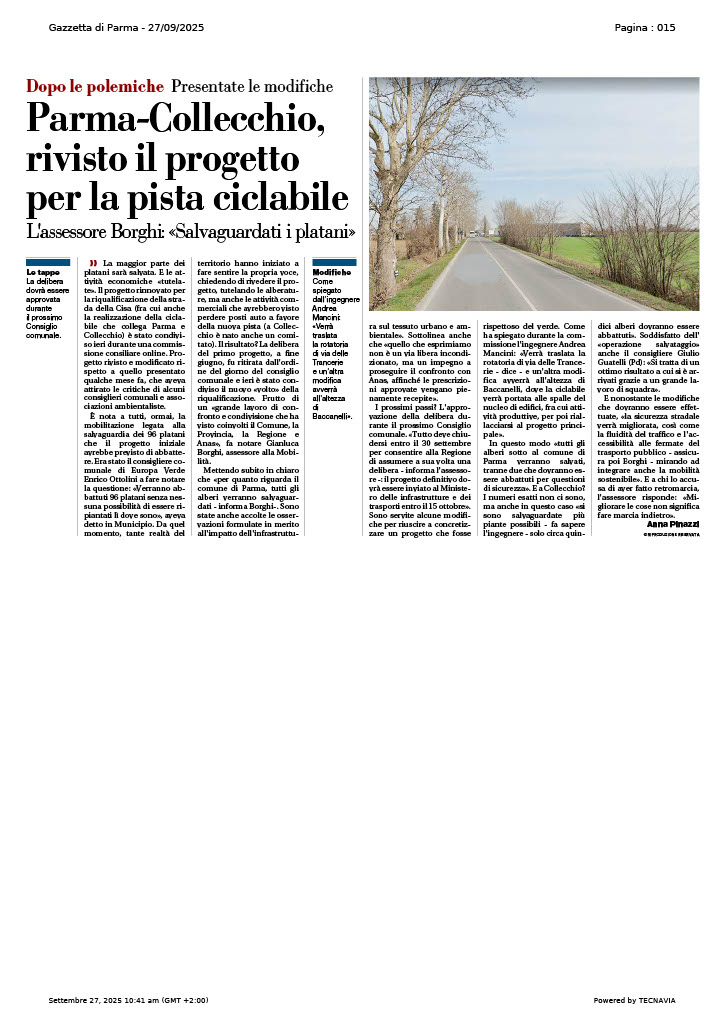 La soluzione ottimale sarebbe zero piante abbattute, ma già questo è un risultato importante e positivo. La mobilitazione dal basso si è rivelata fondamentale, insieme alla buona volontà degli Amministratori coinvolti, in particolare la Sindaca di Collecchio Maristella Galli e il Vicesindaco @Paolo La Marchina e il Sindaco di Parma Michele Guerra, con l’Assessore alla Sostenibilità ambientale @Gianluca Borghi.