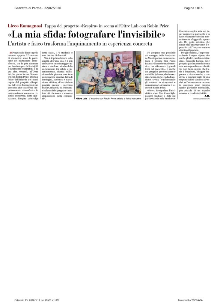 ADA odv – Associazione Donne Ambientaliste sostiene con convinzione il Progetto RESPIRA del Liceo Romagnosi Parma nel cui ambito è stato presentato a Parma il fisico e artista @Robin Price che ha inventato un innovativo sistema per “fotografare l’aria”, rendendo visibile l’inquinamento atmosferico. Un modo concreto e utile per stimolare nei giovani e non solo l’attenzione per la situazione ambientale in cui viviamo. Grazie a Pier Paolo Eramo, agli studenti, alla@Fondazione Monteparma, a @fondazione Cariparma e @ARPAE #airoftheanthropocene,#robinprice,#liceoclassicoromagnosi,#FondazioneMonteParma,#fondazionecariparma,#arpae,#adaassociazionedonneambientaliste