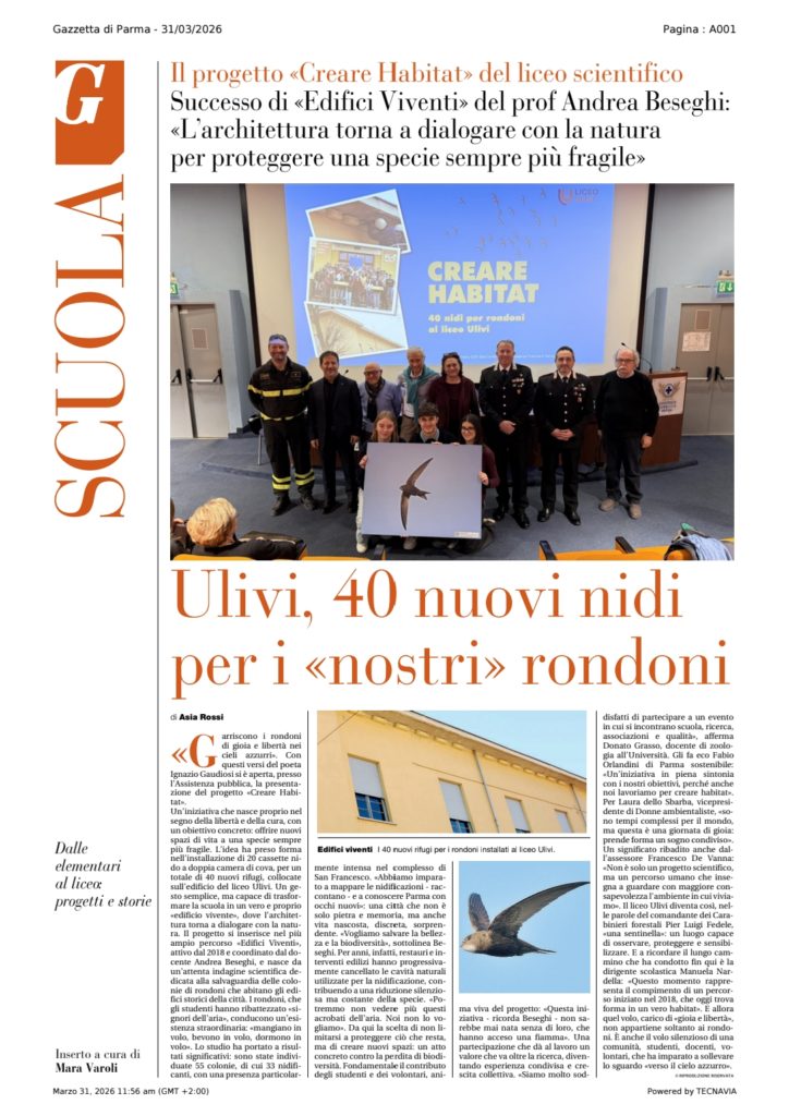 Un bell’articolo di Asia Rossi sulla Gazzetta di Parma del 31 marzo 2026, nell’inserto Scuola curato da Mara Varoli, racconta l’entusiasmante esperienza degli studenti del @Liceo Scientifico Giacomo Ulivi di Parma per ricreare l’habitat riproduttivo per i rondoni.