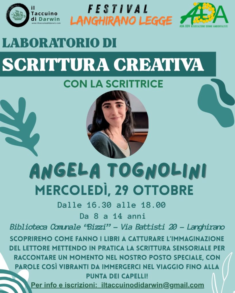 L’invito è per MERCOLEDI’ 29 OTTOBRE , alle ore 16.30, presso il Centro Culturale di Langhirano “Emma Agnetti Bizzi” in via Battisti, 20 a LANGHIRANO al laboratorio di scrittura creativa e sensoriale condotto dalla scrittrice Angela Tognolini.