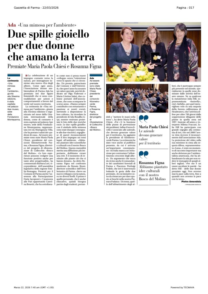 • Premio “Una Mimosa per l’Ambiente” – 35^ edizione – a Parma presso APE Parma Museo sabato 21 marzo 2026 alle ore 16.30. ADA odv premia Maria Paola Chiesi e Rosanna Figna, alla presenza di Julia “Butterfly” Hill, simbolo del movimento ambientalista mondiale.
